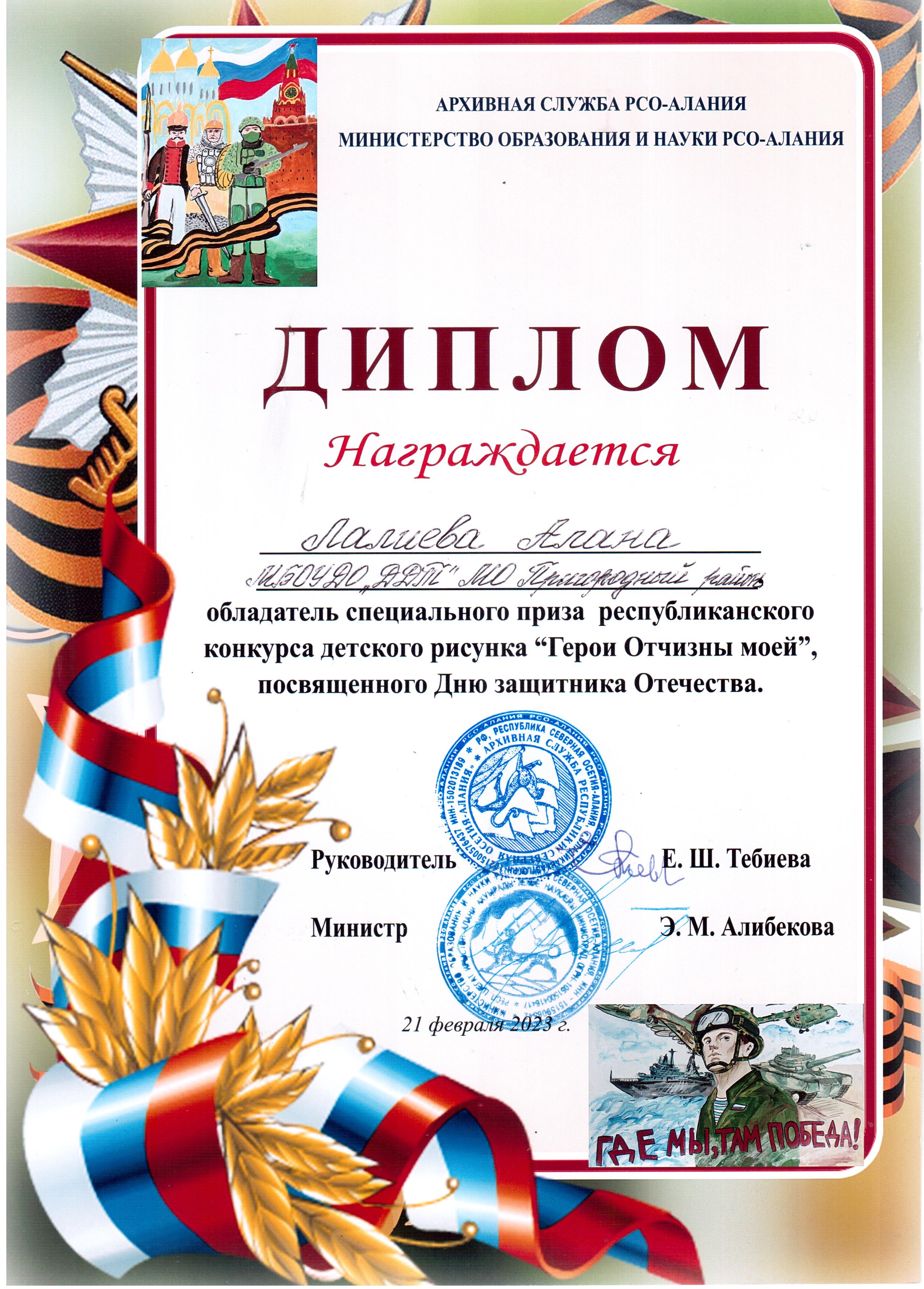 | "Герои Отчизны Моей" - 21 февраля 2023 г. 21 февраля 2023 года в преддверии Дня защитника Отечества были подведены итоги республиканского конкурса детского рисунка «Герои Отчизны моей». Конкурс проводился Архивной службой Республики Северная Осетия-Алания, при поддержке Министерства образования и науки. От Дома детского творчества Пригородного района в конкурсе приняли участие обучающиеся творческого объединения «Умка» (педагог Кабисова С.Б.).Ссылка.